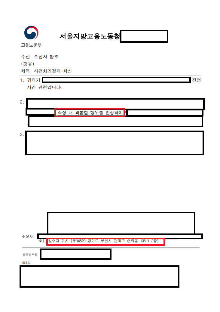 피해자 대리를 통해 관련 자료와 진술을 체계적으로 정리하여 제출하였고, 그 결과 해당 행위는 근로기준법 제76조의2상 직장 내 괴롭힘에 해당한다는 판단을 받았습니다.
