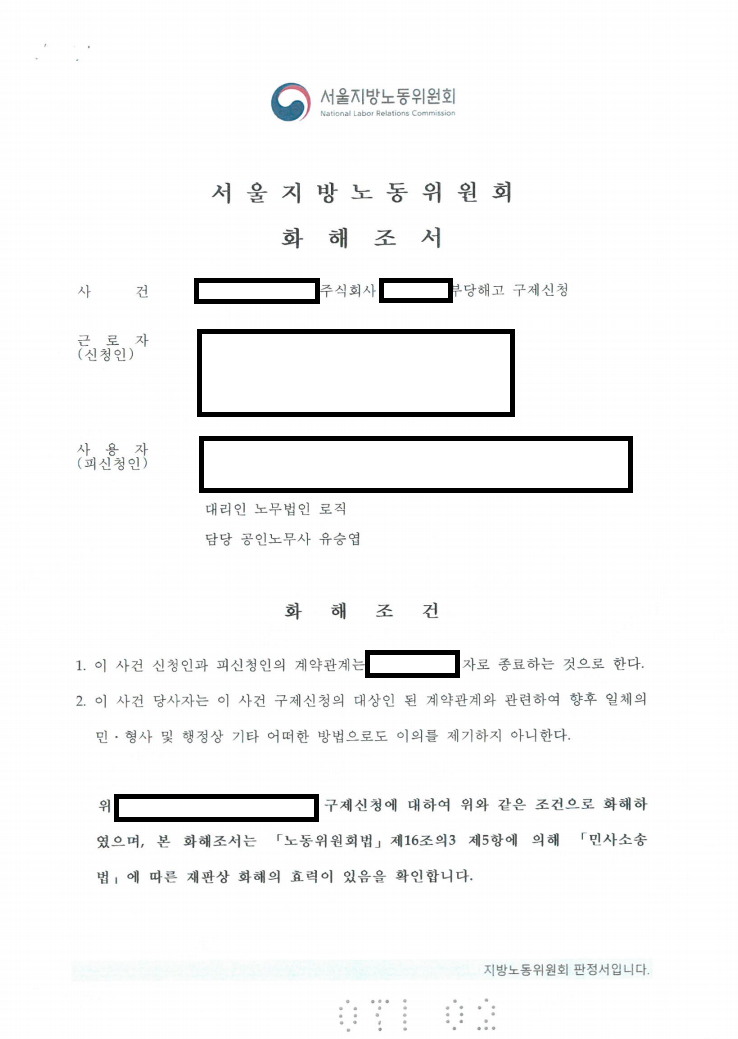 이에 근로자를 설득하여 분쟁을 종결하는 방향으로 조율하였고, 최종적으로 화해조서를 통해 화해금 0원 조건으로 사건을 마무리하였습니다.