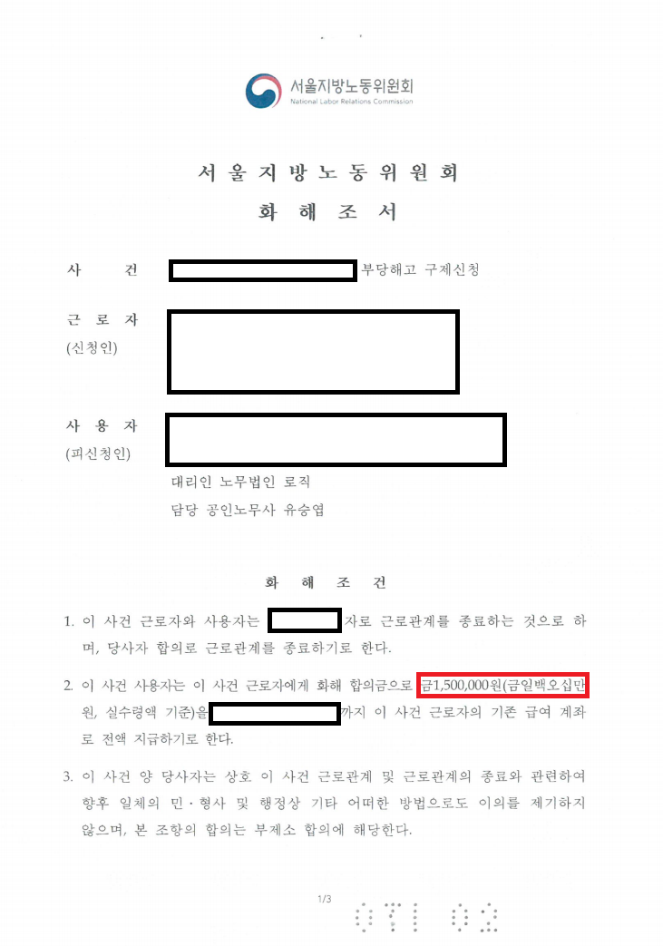그 결과 노동위원회 단계에서 화해가 성립되어, 화해금 150만 원 지급을 조건으로 사건을 마무리할 수 있었습니다.